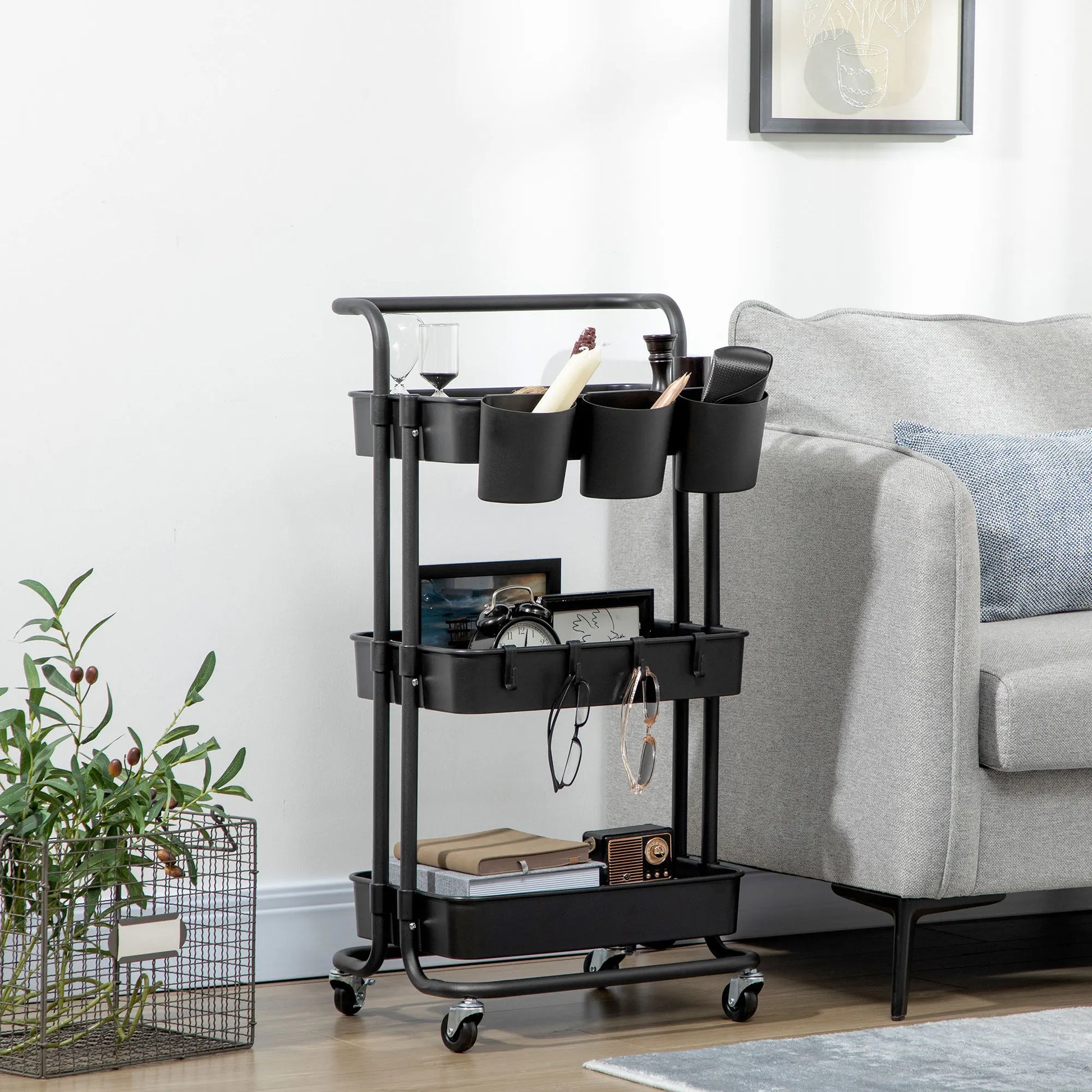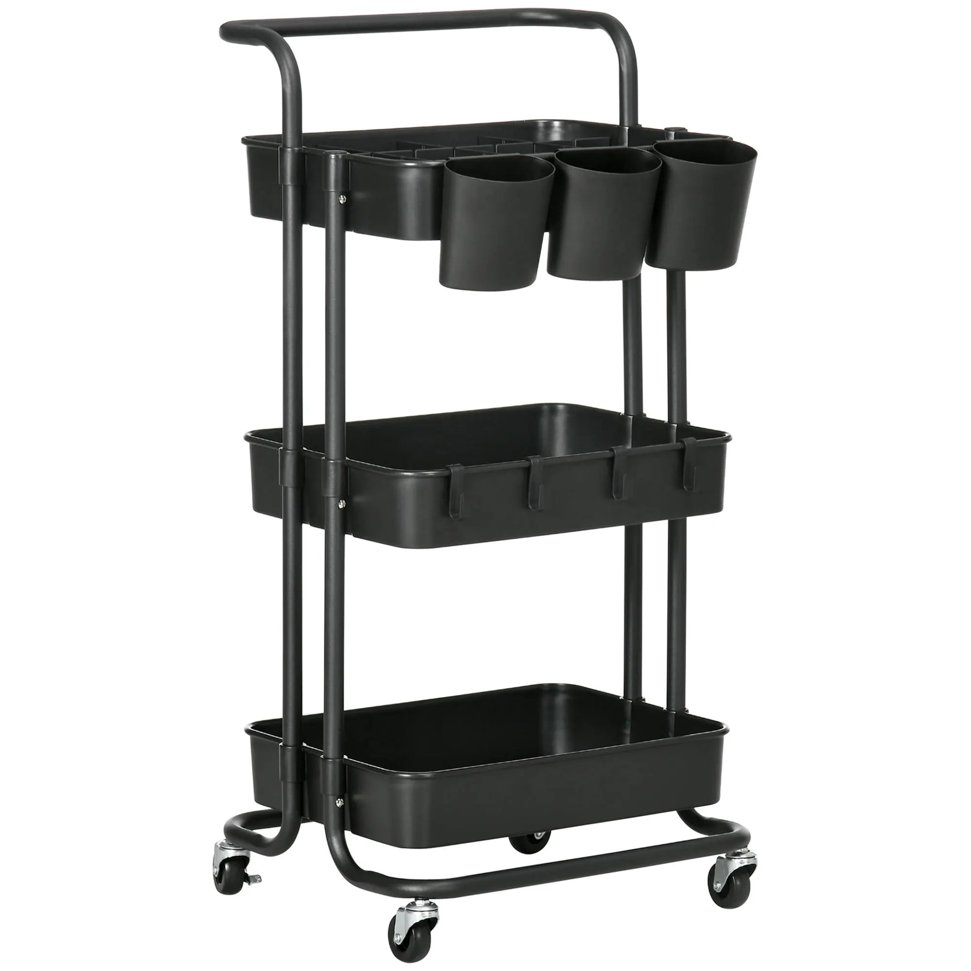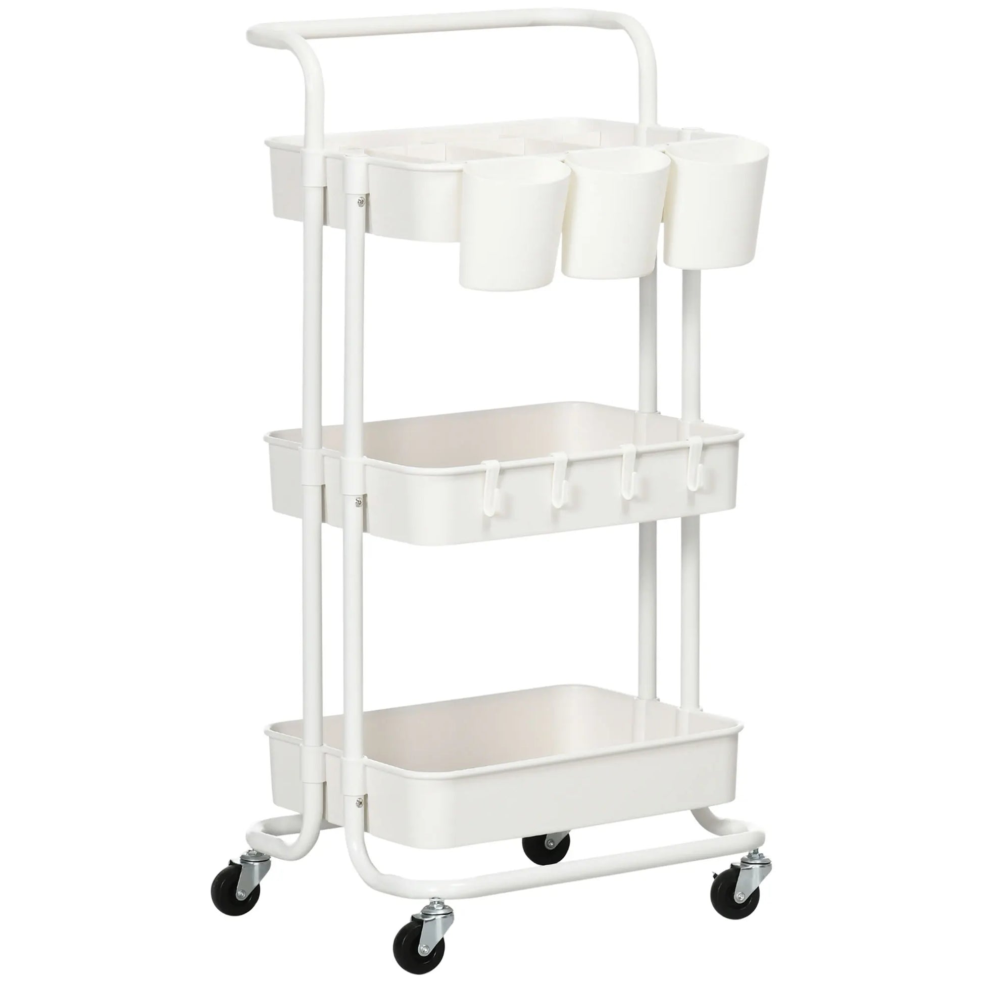 Ce chariot de rangement HOMCOM à roulettes est la solution idéale pour ceux qui souhaitent organiser efficacement un petit espace. Avec ses 3 niveaux de paniers, ses boîtes suspendues amovibles et ses crochets modulables, il s’adapte à toutes vos envies : cuisine, bureau, coin salle de bains ou même chambre à coucher.