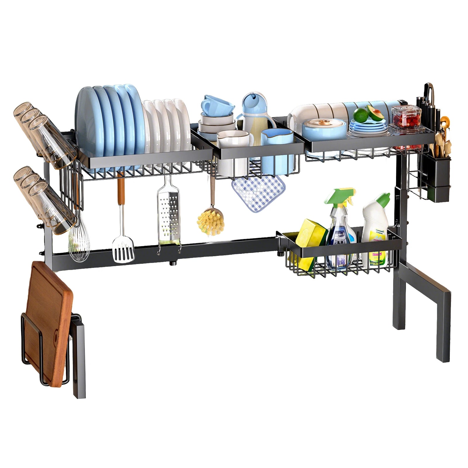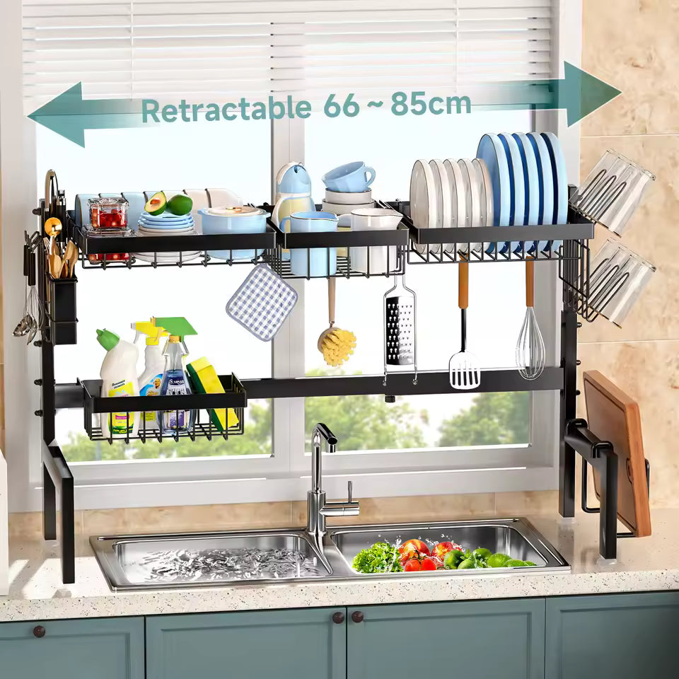 Libérez de la place sur votre plan de travail avec cet égouttoir sur évier intelligent, conçu pour offrir un rangement de vaisselle optimal sans encombrer l'espace. Grâce à sa structure robuste en acier carbone épaissi et son revêtement noir antirouille, il allie durabilité, esthétisme et fonctionnalité.