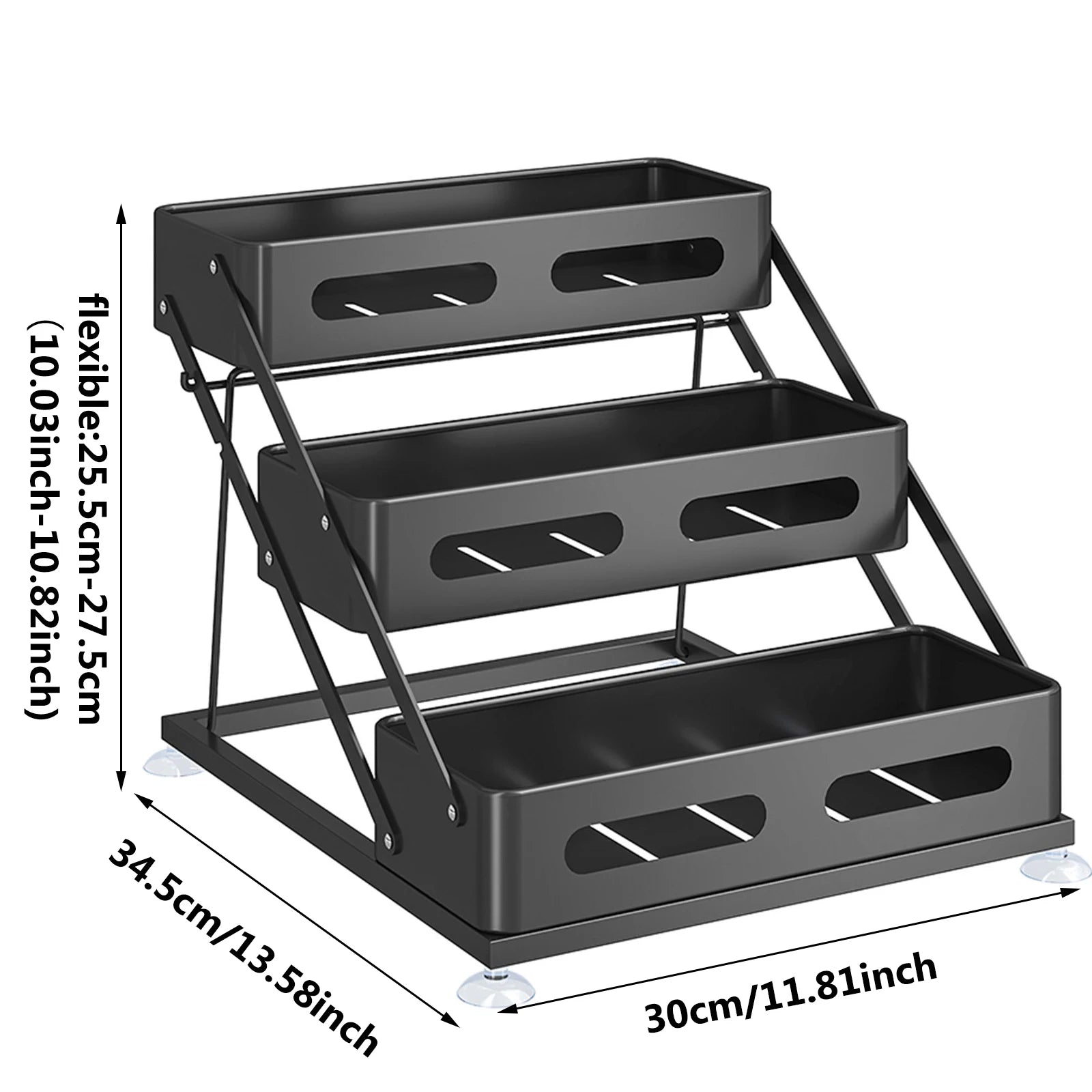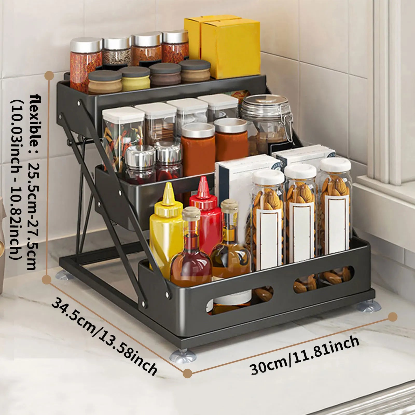 Selon la taille de vos contenants, ajustez librement la hauteur de chaque niveau (de 25,5 cm à 27,5 cm environ). Cette fonctionnalité rend l’étagère compatible aussi bien avec de petits pots d’épices qu’avec des contenants hauts. Idéale pour une cuisine minimaliste, elle optimise l'utilisation de la hauteur et s’intègre aussi bien sur un plan de travail que dans un placard.