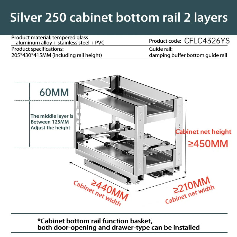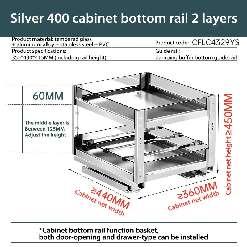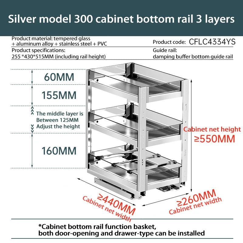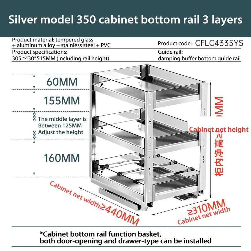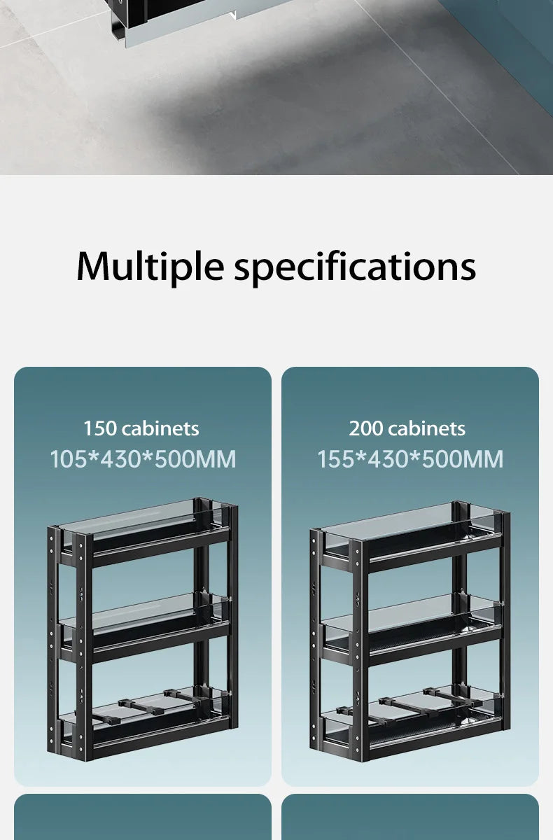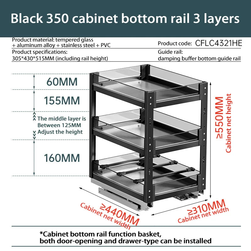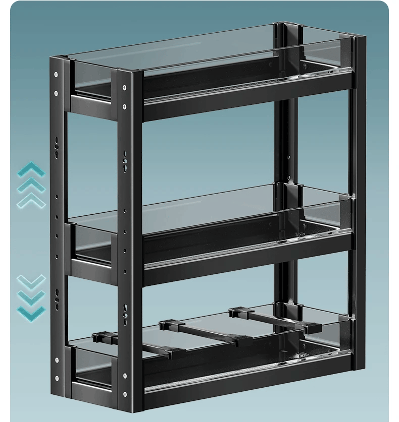 Disponible en 2 ou 3 niveaux, l’organiseur s’ajuste en hauteur selon vos besoins grâce à sa fonction "Adjust Up And Down". Que vous souhaitiez le glisser dans un tiroir de cuisine, un placard bas ou même sur le plan de travail, il s’intègre discrètement à tous les espaces grâce à ses finitions sobres disponibles en noir ou en argenté.