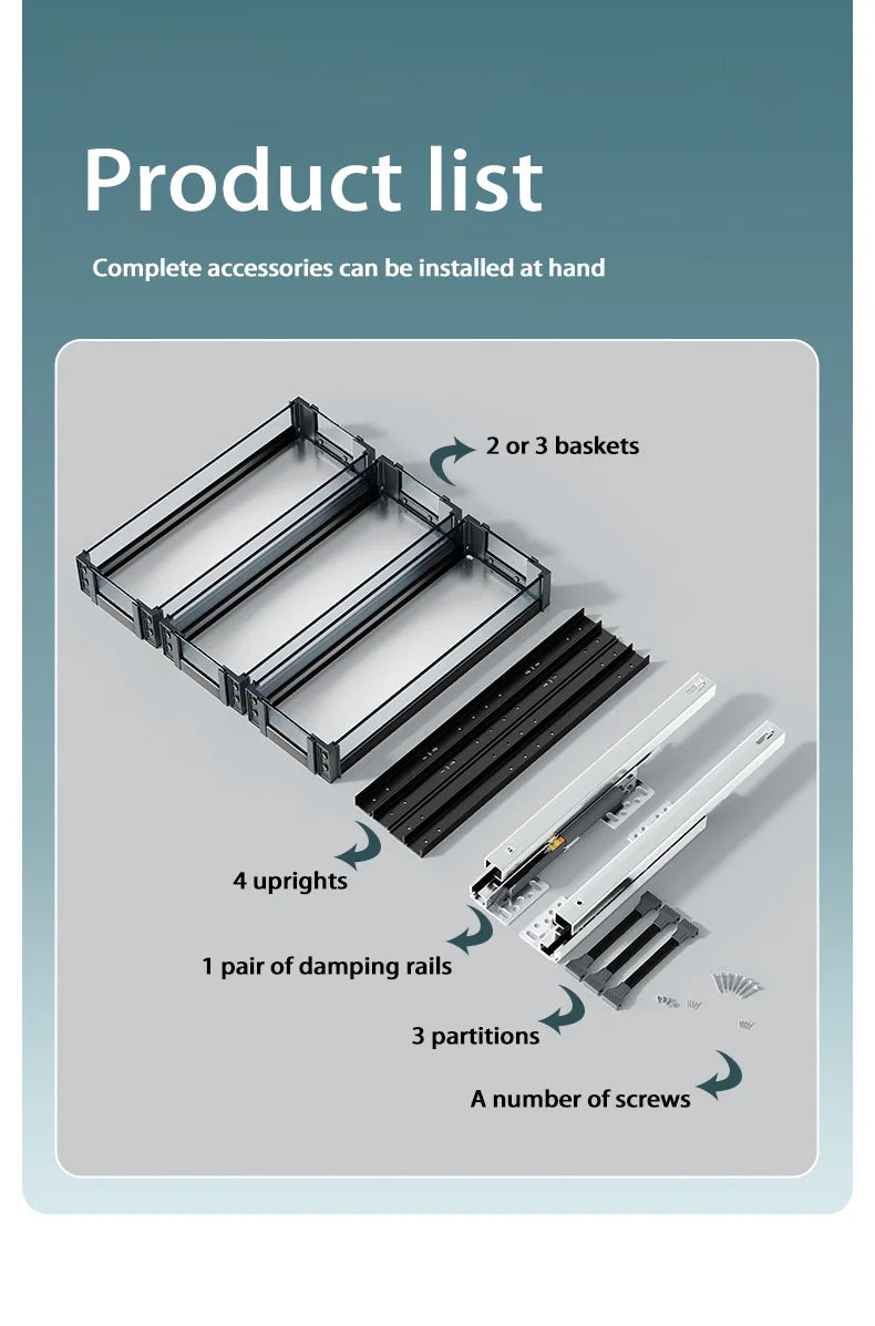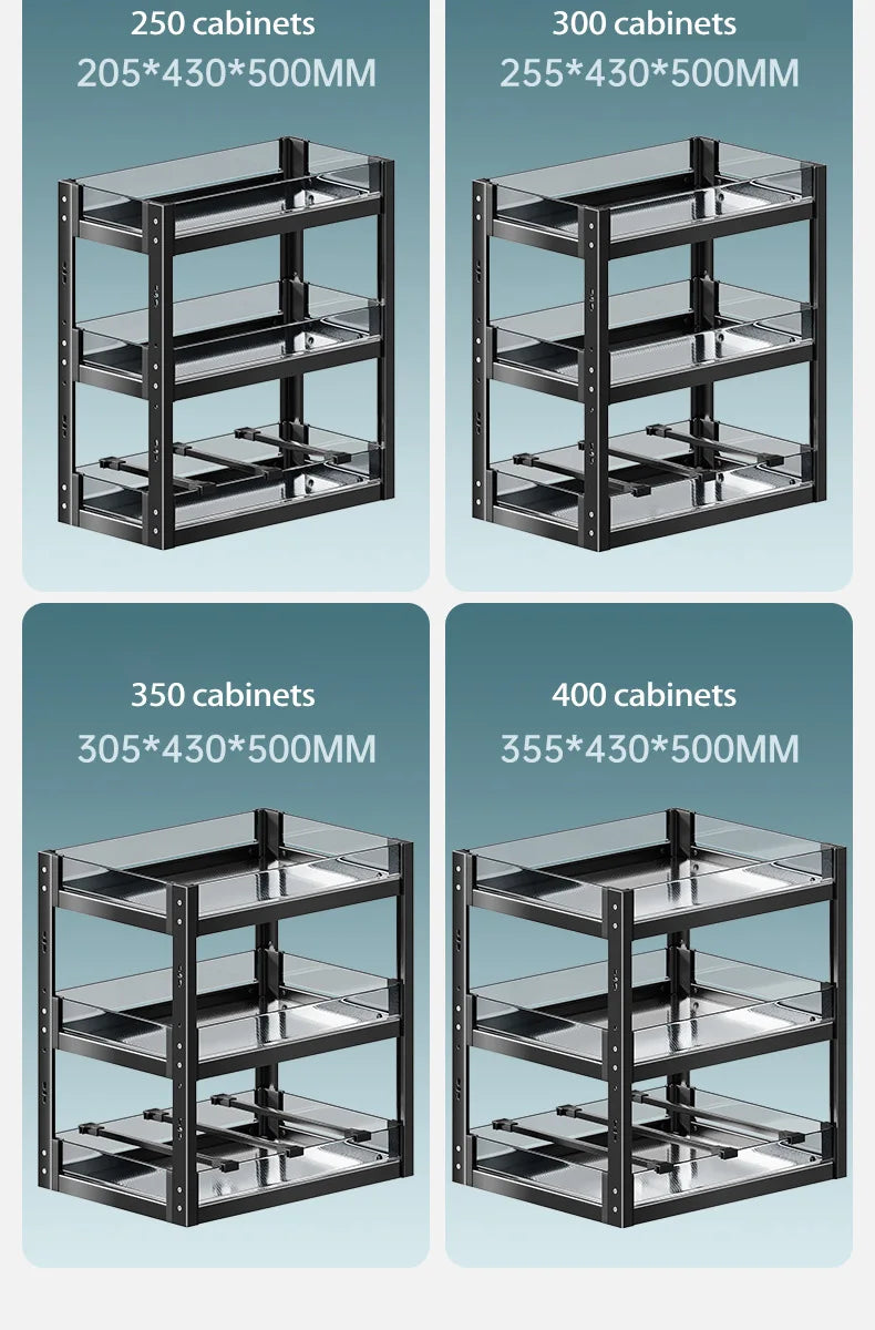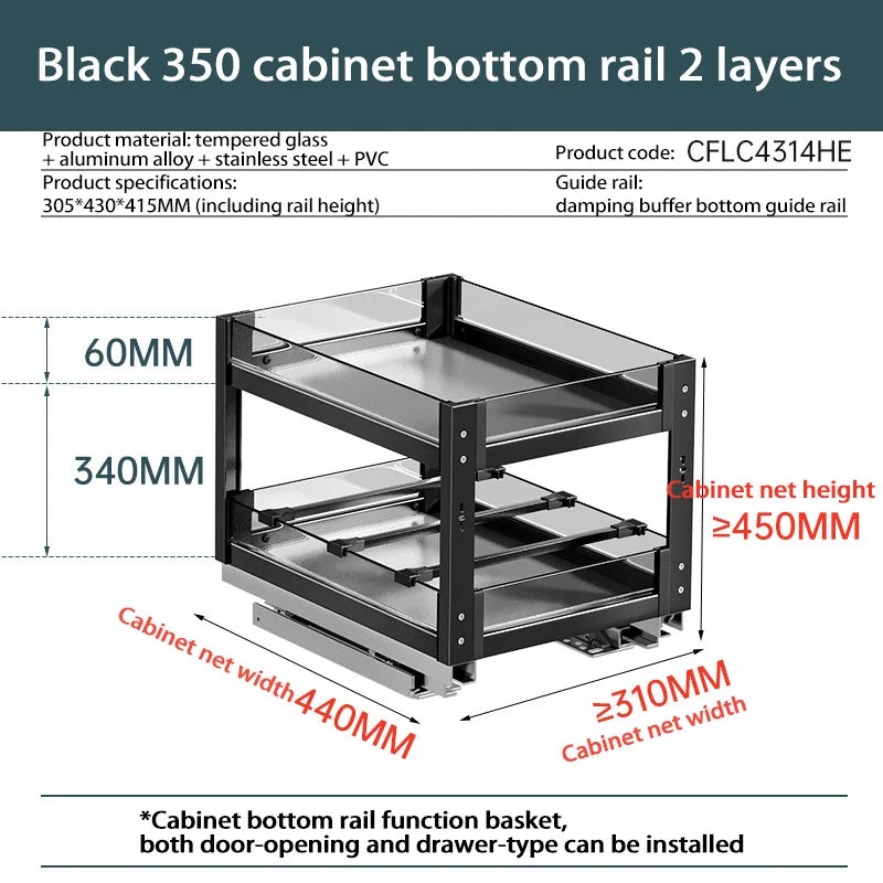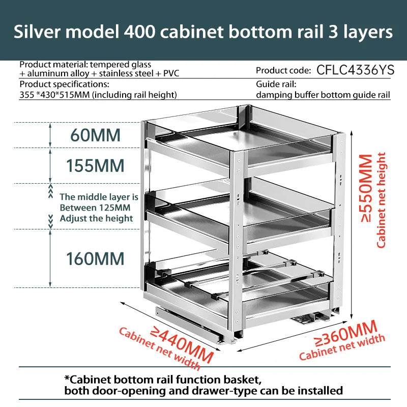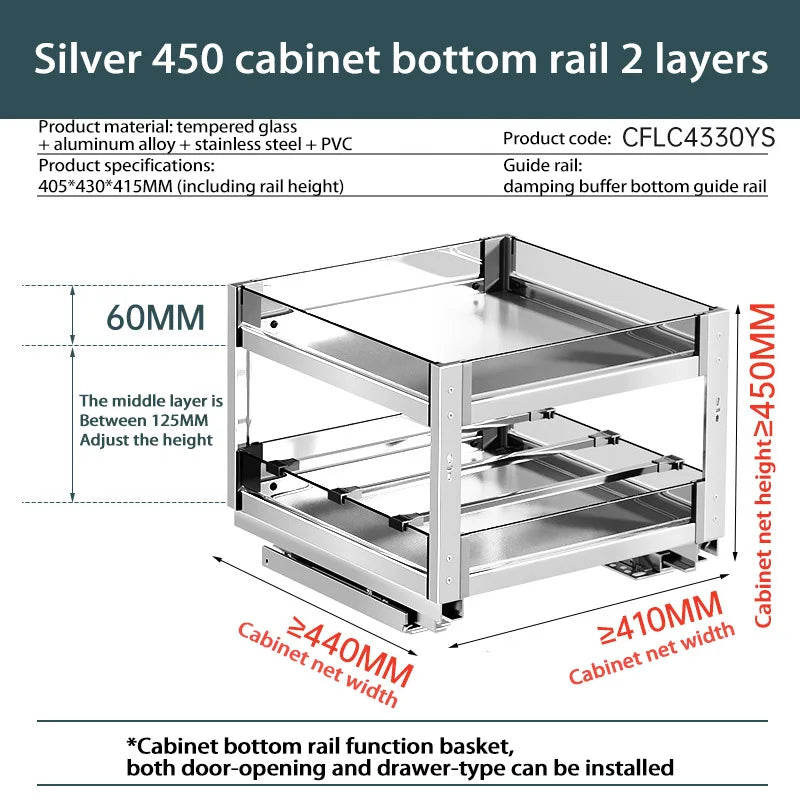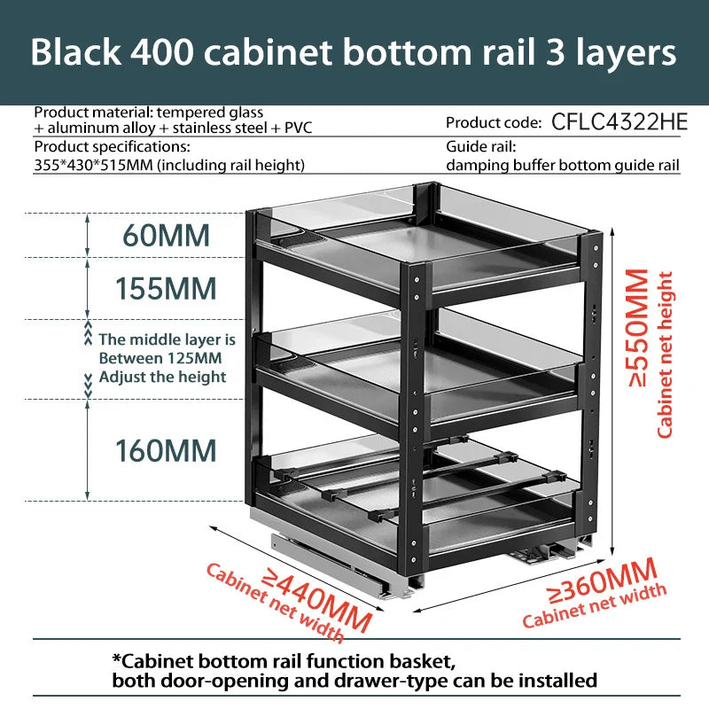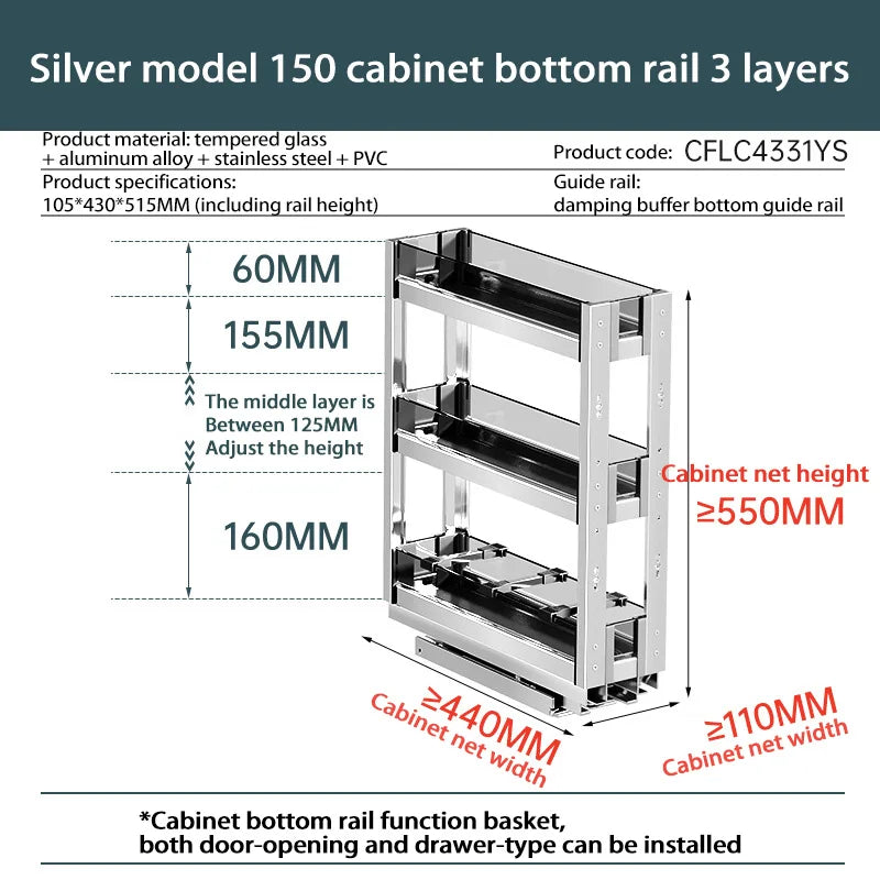 Disponible en 2 ou 3 niveaux, l’organiseur s’ajuste en hauteur selon vos besoins grâce à sa fonction "Adjust Up And Down". Que vous souhaitiez le glisser dans un tiroir de cuisine, un placard bas ou même sur le plan de travail, il s’intègre discrètement à tous les espaces grâce à ses finitions sobres disponibles en noir ou en argenté.